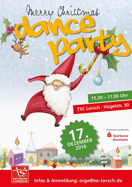 Am 17.12.2916 feiern wir eine X-Mas Dance-Party. Im Clubheim in der Lorscher Hügelstraße steht zwischen 15:30 Uhr und 17 Uhr das Weihnachtmotto beim Tanzen im Mittelpunkt. Herzlich willkommen! Infos und Anmeldung bitte bei orga@tsc-lorsch.de
